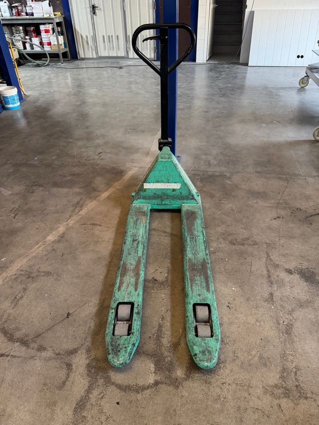 Transpaleta manual de color verde, ideal para mover cargas pesadas en almacenes o talleres. - Estructura robusta. - Ruedas resistentes. SE ENVÍA PREVIO PAGO POR BIZUM.