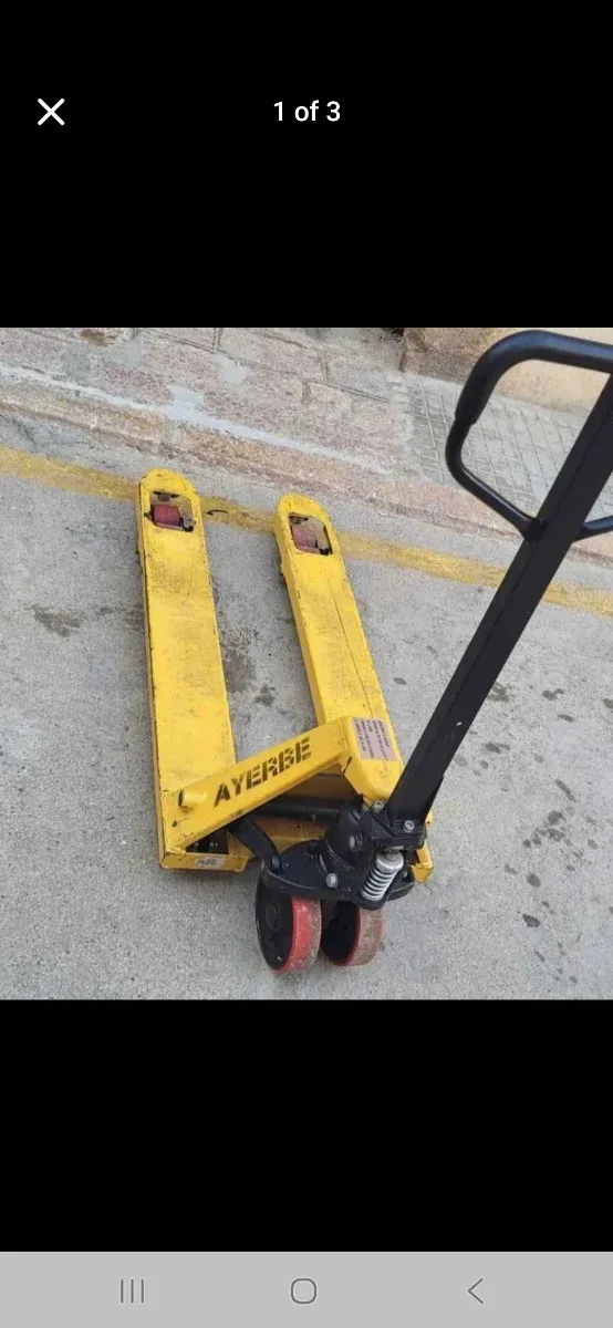 Transpaleta manual de la marca AYERBE, ideal para mover cargas. Rodamientos Inox nuevos - Color amarillo. - Ruedas dobles. - Mango ergonómico.
