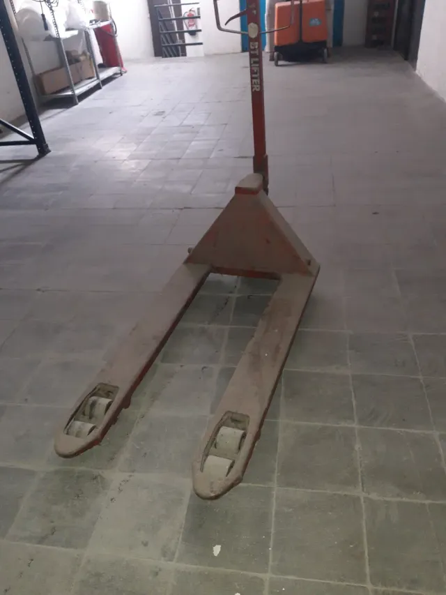 Transpaleta manual con detalles en el sistema hidráulico que necesita reparación. - Ideal para piezas o para quien sepa arreglarla. - Estructura robusta.
