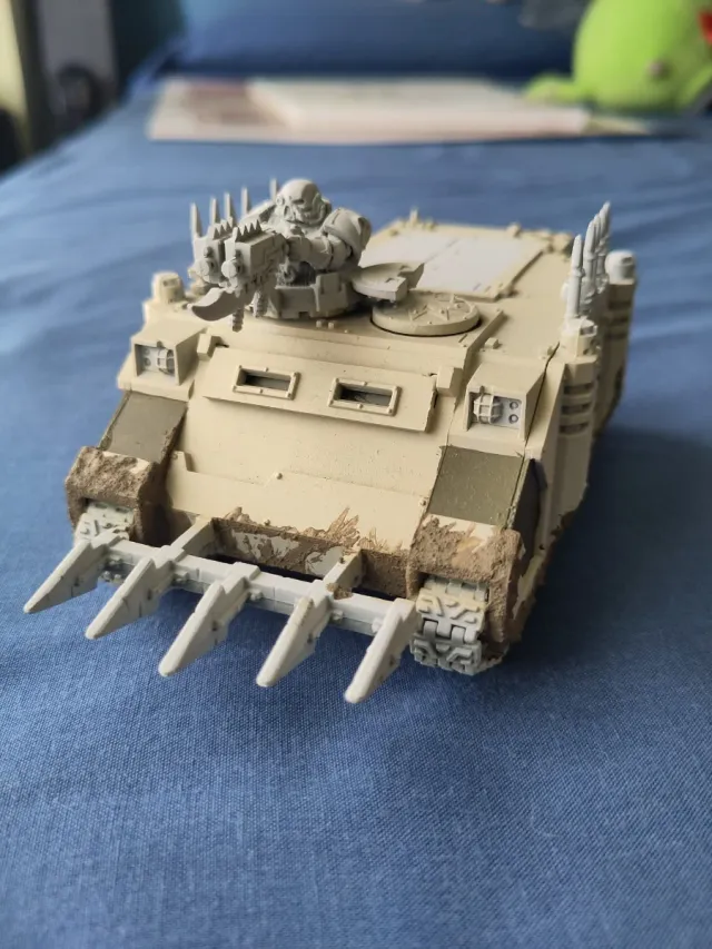 -1 Vehículo Rhino de Death Guard para Warhammer 40,000. Modelo a medio pintar. Incluye matrices de conversión con accesorios, tal como se ve en las fotos.