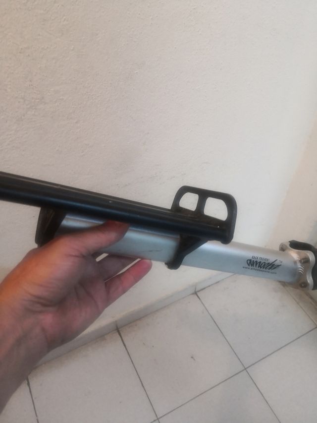 Detalles del productoTransportín de aluminio para bicicleta gravel, ruta,en buen estado, se fija a la tija de la bicicletamuy muy ligero, solobsecha utilizado en un camino de Santiago .