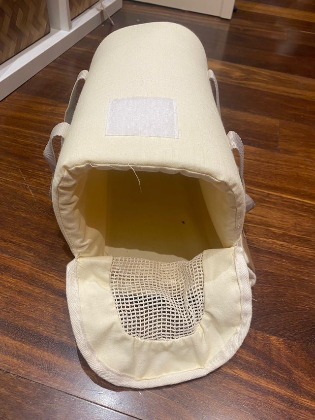 Detalles del productoTransportín de tela color crema, ideal para mascotas pequeñas.