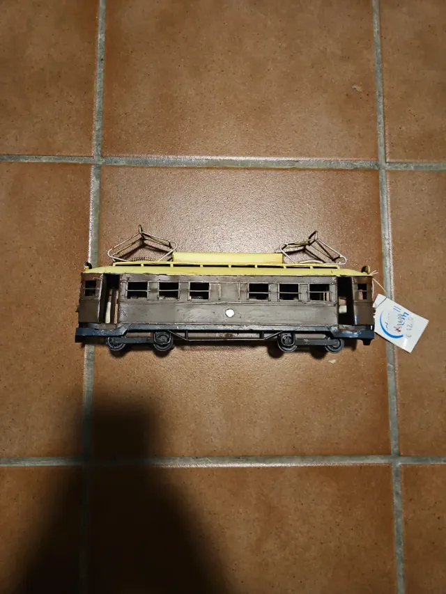 Tranvía metálico con detalles decorativos. - Diseño de tranvía clásico. - Techo amarillo. - Ventanas rectangulares.