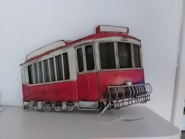 Detalles del productoPrecioso tranvía decorativo de metal, ideal para añadir un toque vintage a tu hogar. Es de color rojo y blanco, con detalles en plateado.