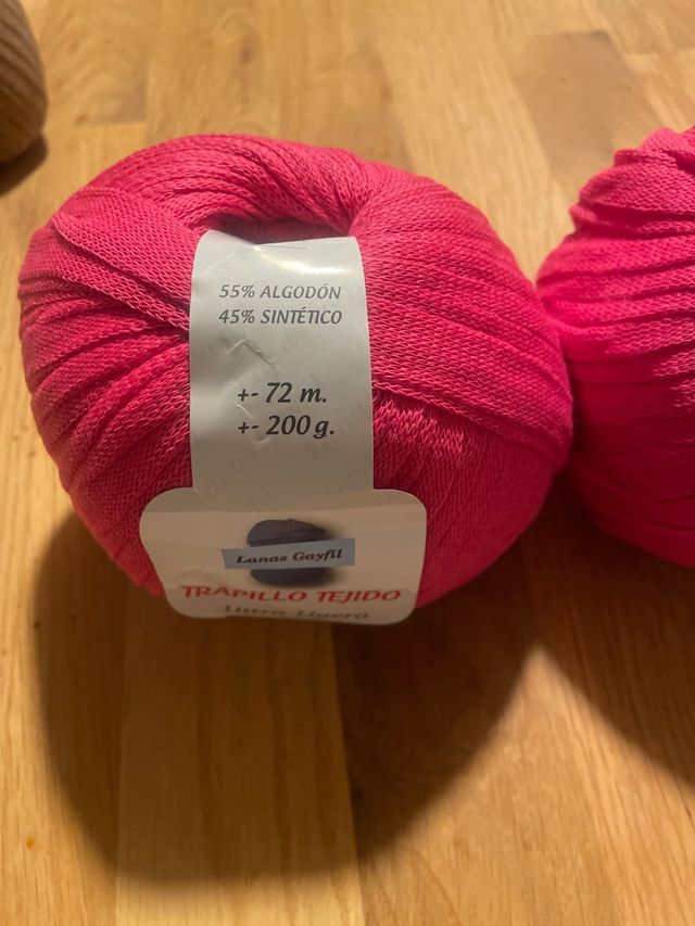 Ovillo de trapillo tejido en color fuscia. - Composición: 55% algodón, 45% sintético. - Longitud aproximada: 72 m. - Peso aproximado: 200 g. dos bobinas 8eu