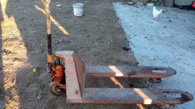 Detalles del productoTraspalet manual de color naranja, ideal para mover cargas pesadas en almacenes o talleres.