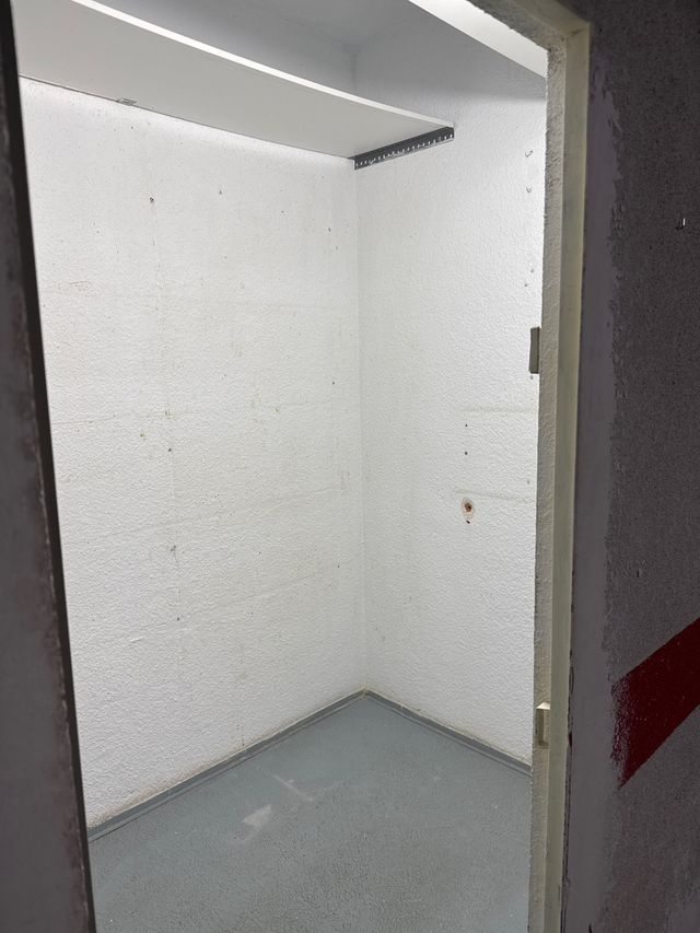 Espacio de almacenamiento adicional. - Paredes blancas texturizadas. - Suelo gris. - Estantería blanca en la parte superior. son aproximadamente 18 metros cúbicos