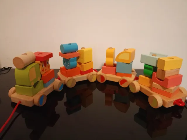 Detalles del productoTren de arrastre de madera con bloques de construcción para niños pequeños.