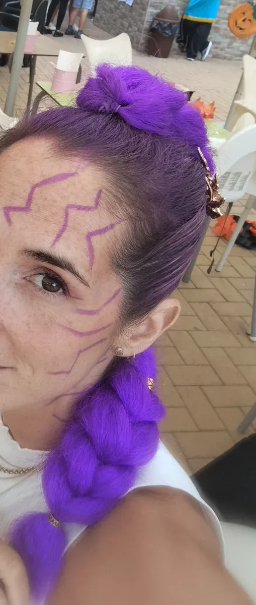Detalles del productoTrenza de color morado de unos 60cm aproximadamente, 100% Kanekalon. Ideal para disfraz de Rumi, se puede deshacer y volver a hacer como prefieras.