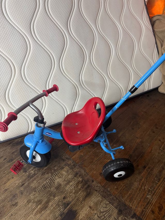 Triciclo azul y rojo con barra de empuje