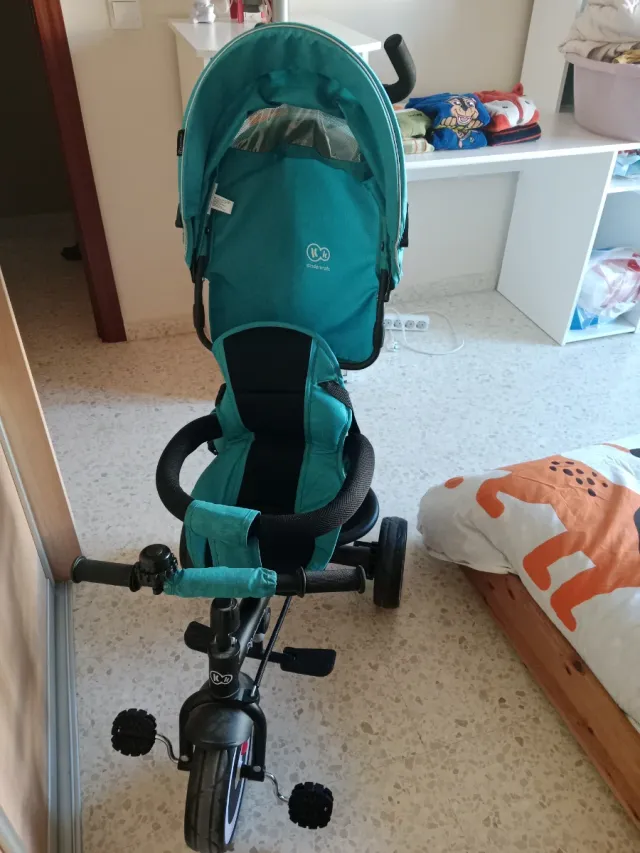 Triciclo para bebés en color turquesa y negro. Ideal para los primeros paseos. - Asiento acolchado. - Capota. - Barra de seguridad. - Reposapiés.