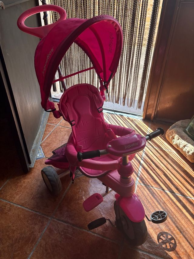 Triciclo/carro rosa para transportar a los más pequeños. Ideal para paseos. - Color rosa. - Capota protectora. - Barra de empuje para padres. - Reposapiés.