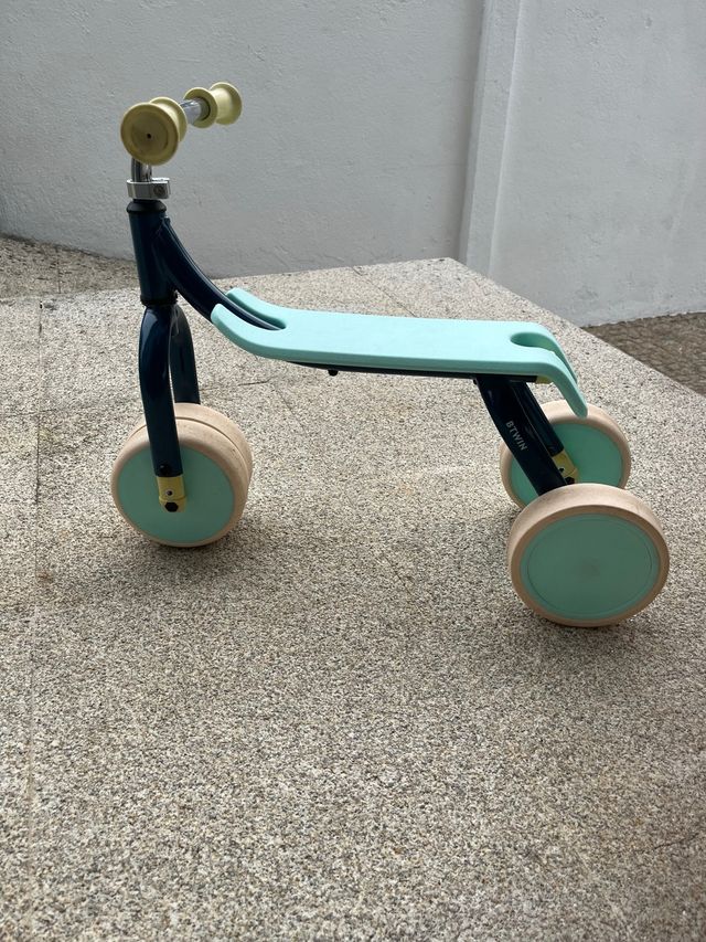 Triciclo evolutivo Btwin con asiento y manillar ajustables. - Estructura de metal resistente. - Ruedas de madera y goma. - Diseño moderno en azul y verde menta.