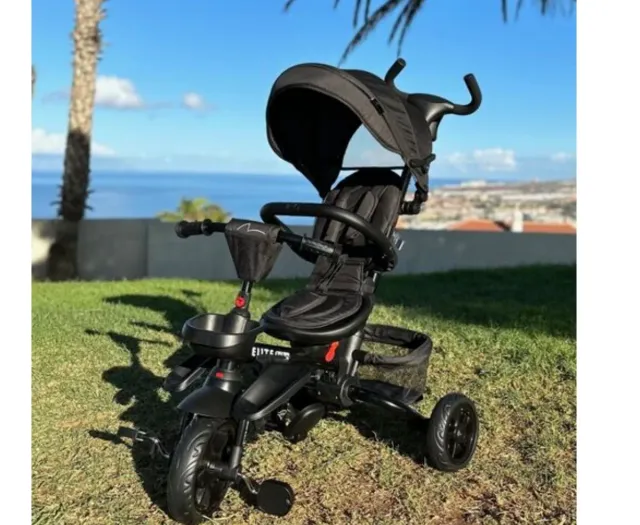 Triciclo evolutivo en color negro, diseñado para acompañar el crecimiento del niño. - Estructura robusta. - Asiento acolchado. - Capota protectora. - Cesta de almacenamiento.
