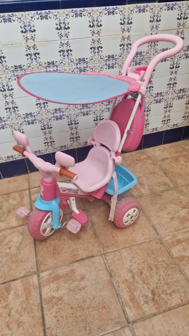 Detalles del productoTriciclo feber infantil de color rosa y azul, con capota y cesta.
