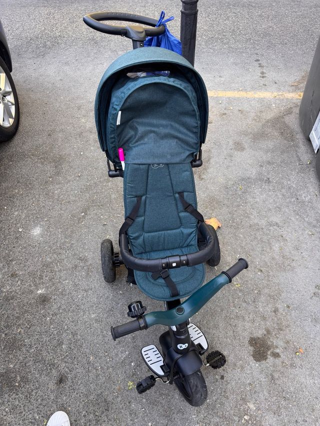 Triciclo infantil de color azul marino. - Asiento acolchado. - Barra de seguridad. - Capota. - Reposapiés. - Manillar ajustable.