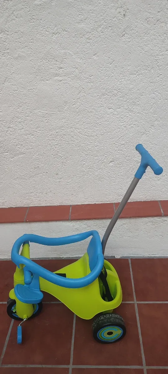 Detalles del productoTriciclo de color verde y azul, ideal para los más pequeños. Cuenta con un práctico empujador para que los adultos puedan guiarlo.