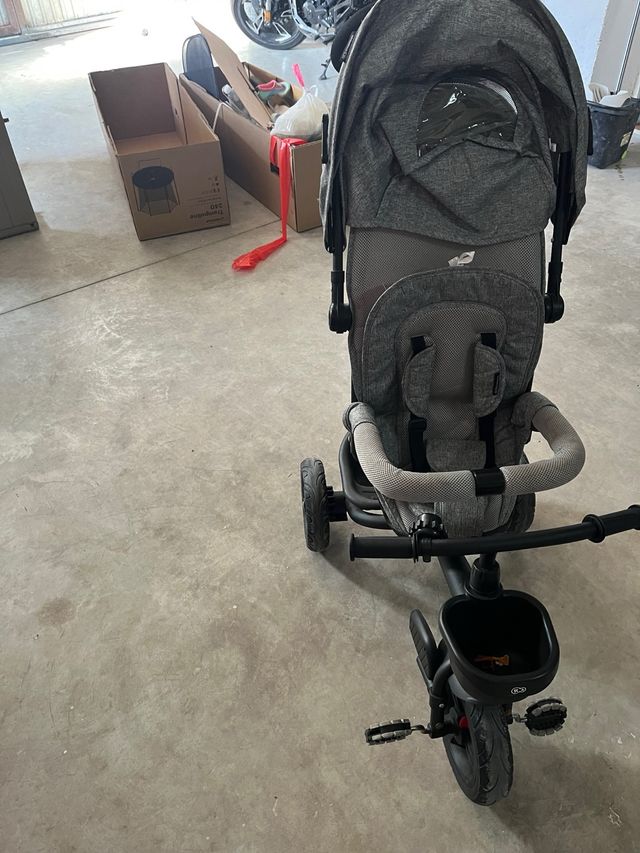 Triciclo infantil de color gris, ideal para paseos. - Estructura resistente. - Asiento acolchado. - Barra de seguridad. - Reposapiés. - Cesta de almacenamiento.