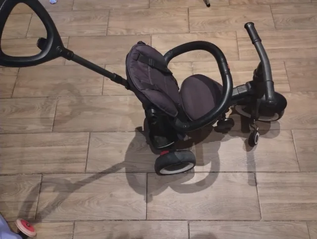 Triciclo infantil de color negro, ideal para paseos. - Asiento acolchado. - Barra de empuje. - Reposapiés.