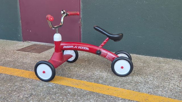 Triciclo clásico de la marca Radio Flyer en color rojo. - Diseño de tres ruedas. - Asiento negro. - Manillar cromado con puños rojos.