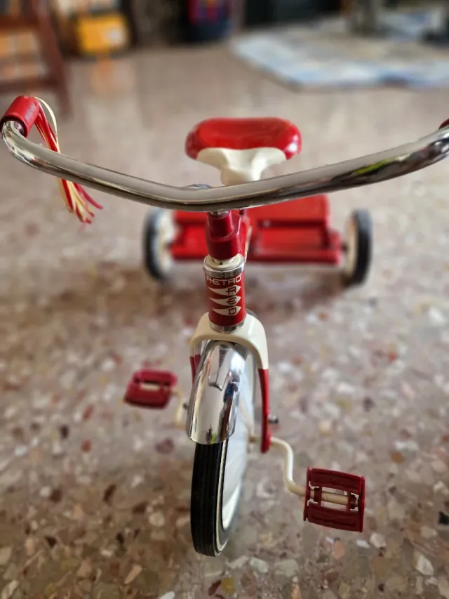 Triciclo clásico de Radio Flyer en color rojo. Un juguete divertido y retro. - Manillar cromado con puños rojos. - Asiento rojo y blanco. - Pedales rojos.