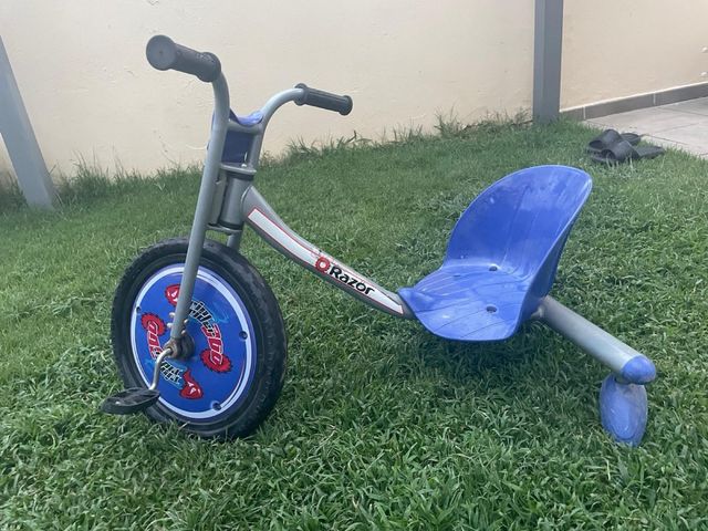 Triciclo Razor con asiento azul y estructura gris. - Rueda delantera grande con diseño. - Pedales negros. - Ruedas traseras giratorias.