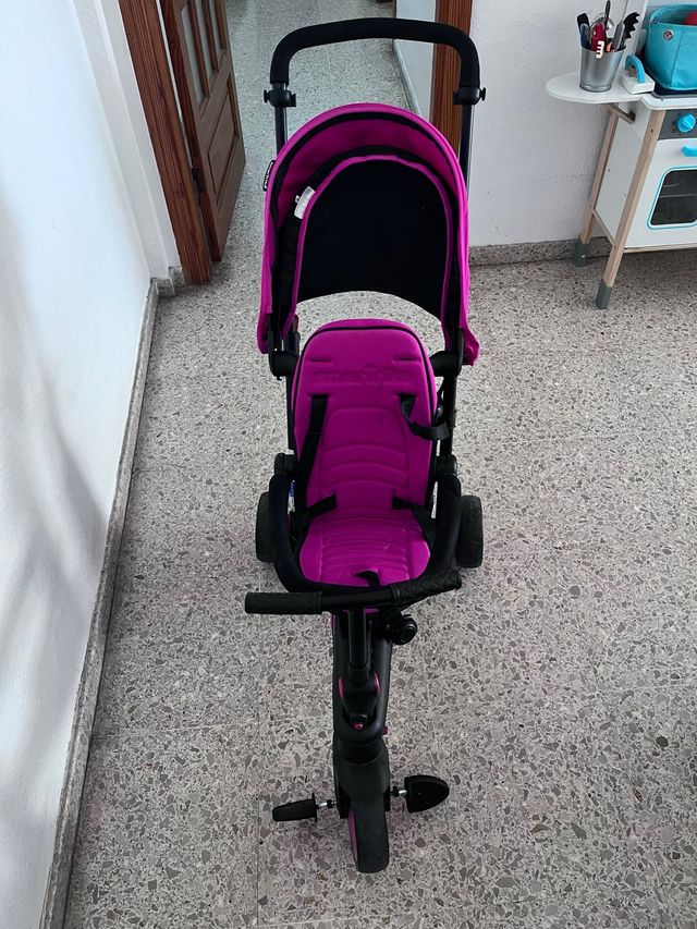 Triciclo SmartTrike en color rosa, ideal para paseos. - Asiento acolchado. - Capota protectora. - Barra de empuje. - Reposapiés.