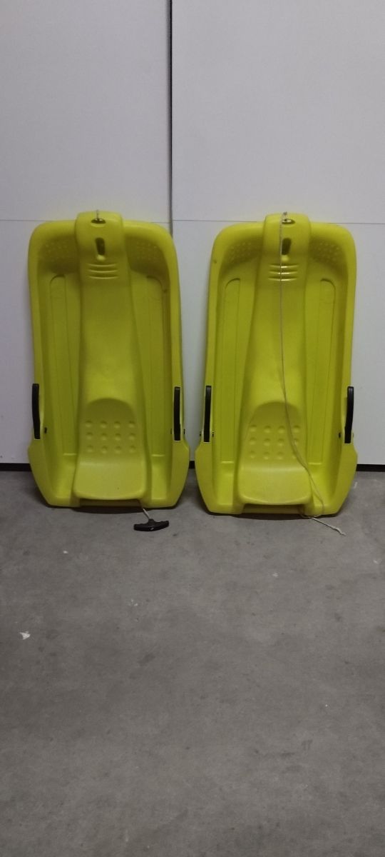 Dos trineos de plástico de color amarillo, perfectos para disfrutar de la nieve, uno perfecto otro tiene una pequeña raja 10€ los dos