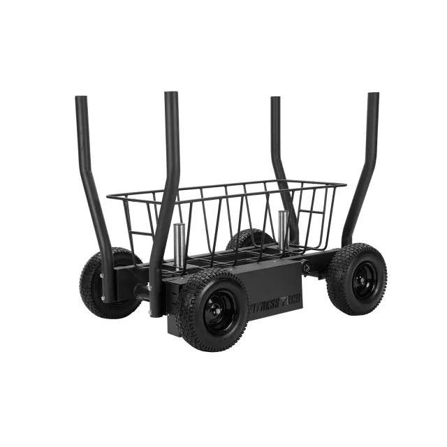 Equipado con ruedas neumáticas de 30 cm para un deslizamiento fluido en césped, pavimento o cemento, sin dañar la superficie. Su estructura de acero reforzada ofrece estabilidad y durabilidad, mientras que la cesta central y los soportes laterales permiten añadir discos y accesorios.