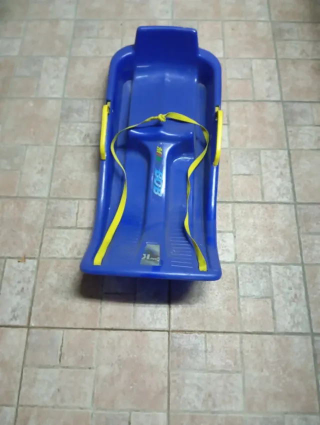 Detalles del productoTrineo de plástico azul, ideal para disfrutar de la nieve. Cuenta con dos cintas de sujeción amarillas.