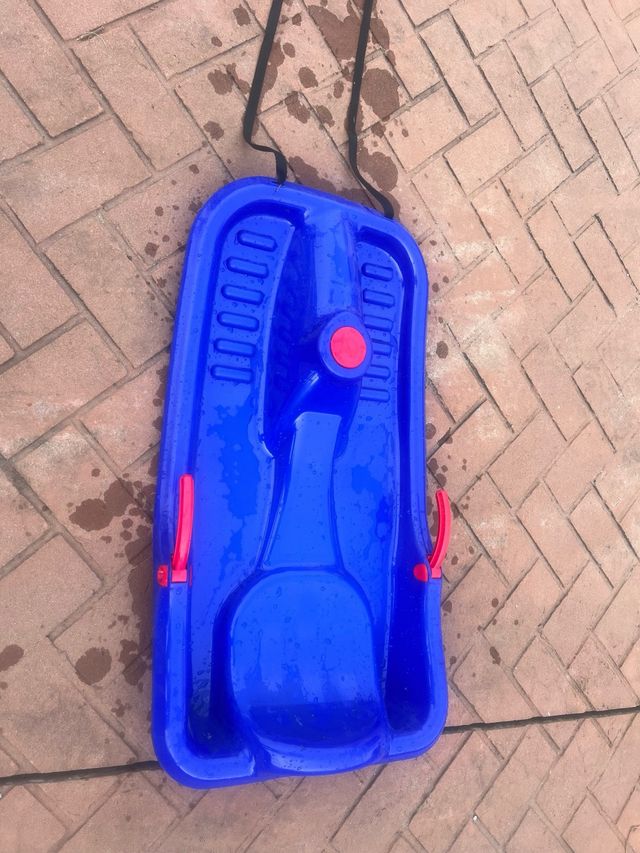 Trineo de plástico azul con asas rojas y cuerda para transportarlo. - Diseño ergonómico. - Material resistente.