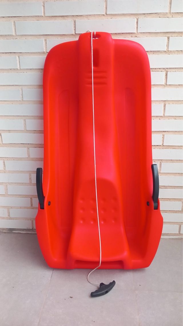 Detalles del productoTrineo de plástico rojo para una persona, ideal para disfrutar de la nieve. Cuenta con un sistema de frenos para mayor control.