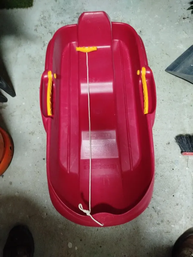Detalles del productoTrineo de plástico rojo para deslizarse por la nieve. Tiene asas laterales y una cuerda para tirar de él.