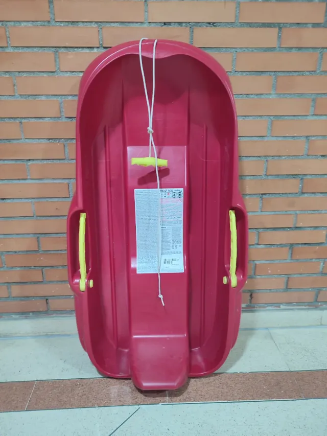 Detalles del productoTrineo de plástico rojo, ideal para deslizarse por la nieve. Cuenta con dos asas laterales amarillas para un mejor agarre y una cuerda para arrastrarlo.