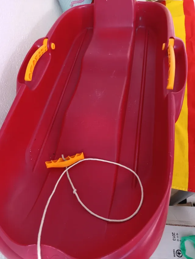 Detalles del productoTrineo doble de plástico rojo, ideal para deslizarse por la nieve. Cuenta con dos asas naranjas para un mejor agarre y una cuerda para facilitar su transporte.