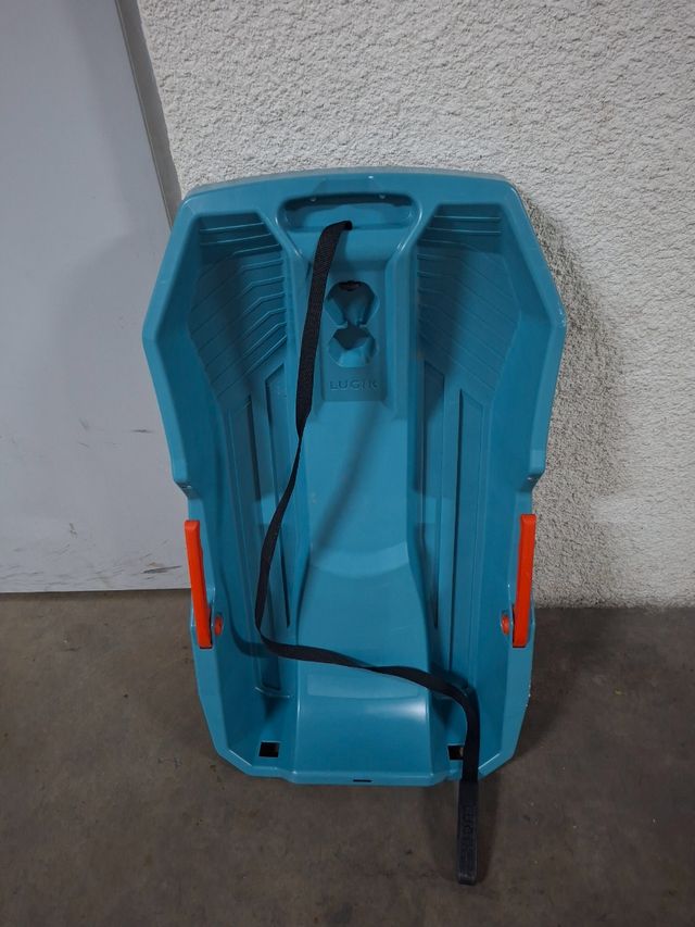 Detalles del productoTrineo de plástico resistente en color azul, con asas laterales naranjas y asa de arrastre.