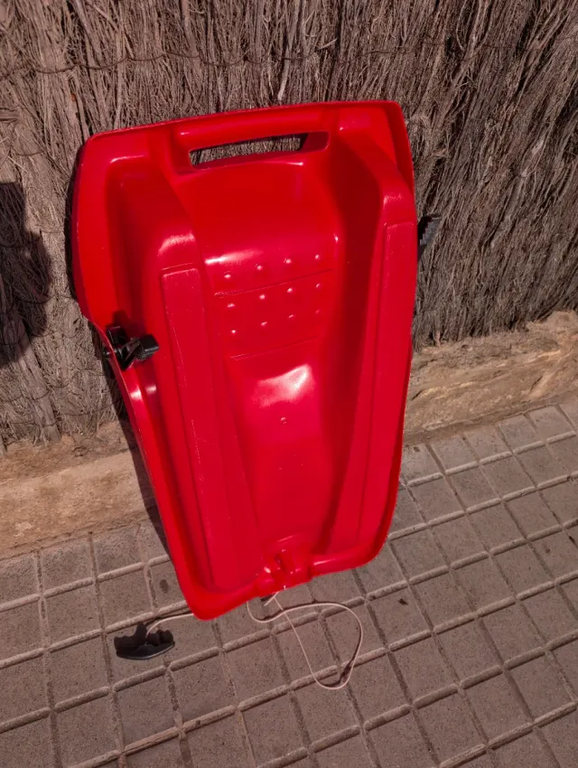 Trineo de color rojo, ideal para deslizarse por la nieve. Está en muy buen estado, con poco uso. - Diseño ergonómico. - Asa para transporte. - Cuerda de arrastre.