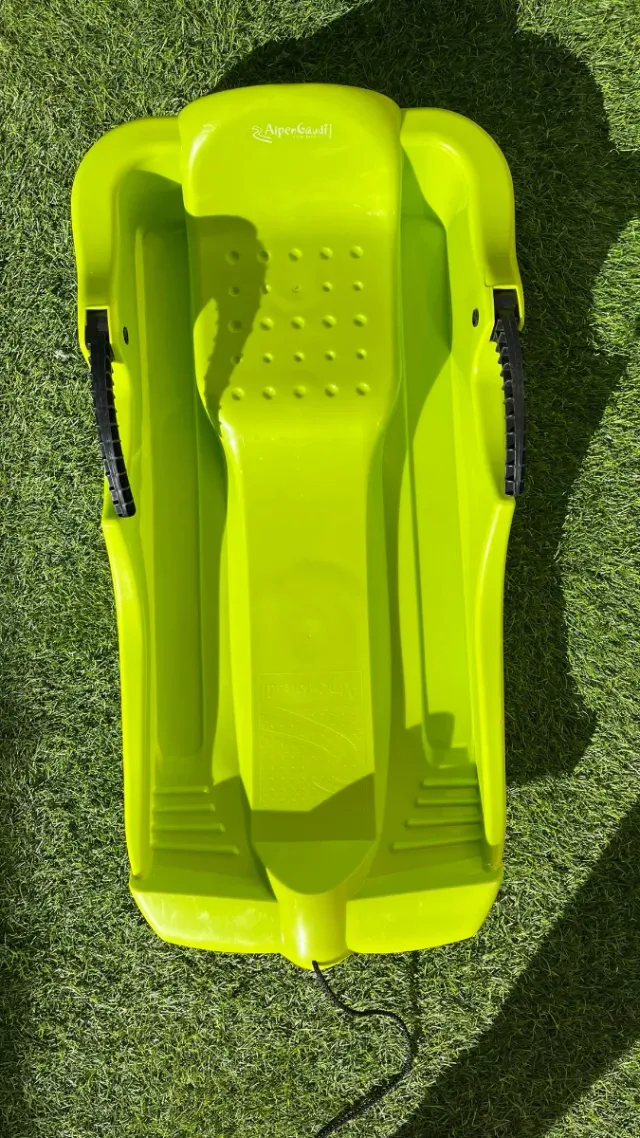 Detalles del productoTrineo de plástico de color verde brillante, ideal para deslizarse por la nieve. Cuenta con asas laterales para un mejor agarre y una cuerda para facilitar su transporte. Está como nuevo, pero tiene una pequeña raja (se ve en la 4a foto).