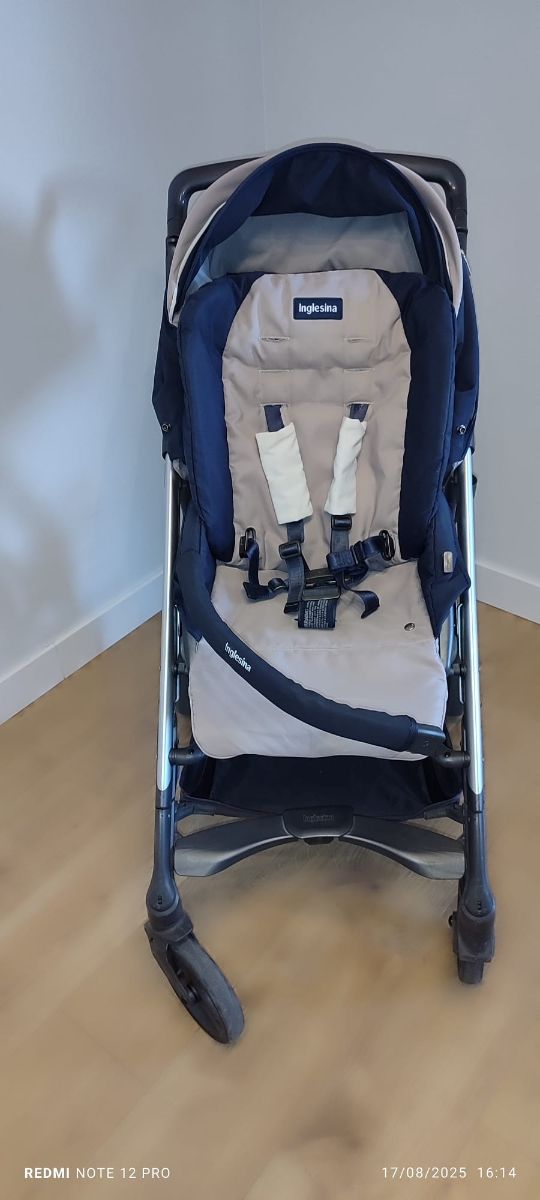 Conjunto de paseo para bebé de la marca Inglesina, en color azul y beige. - Silla de paseo. - Capazo. - Silla de coche (Maxicosi).