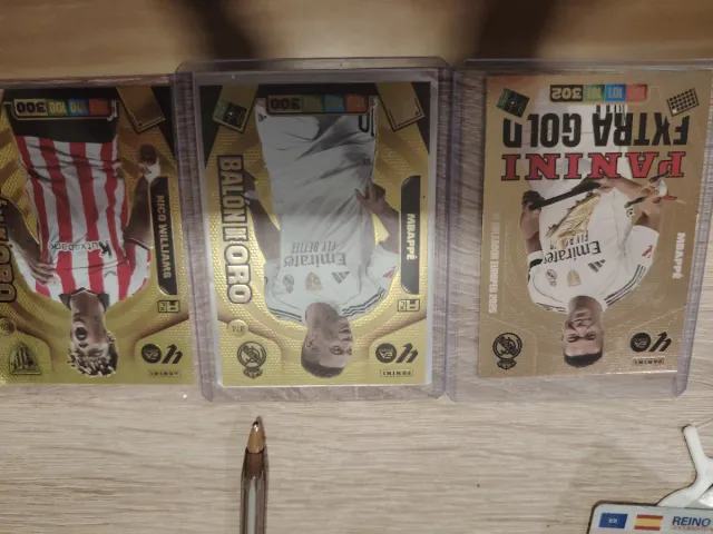 Conjunto de tres cromos Panini Adrenalyn XL de la colección Balón de Oro y Extra Gold.