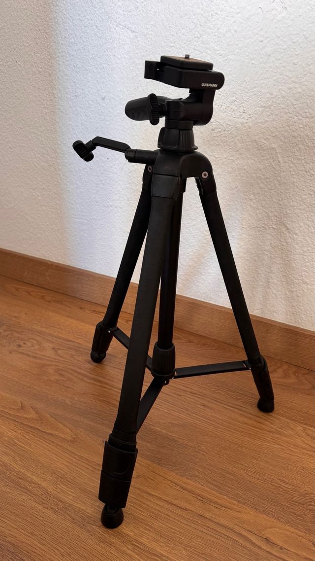 Trípode negro de la marca Cullmann. - Diseño robusto y estable. - Patas ajustables para diferentes alturas. - Cabezal giratorio para posicionamiento versátil.