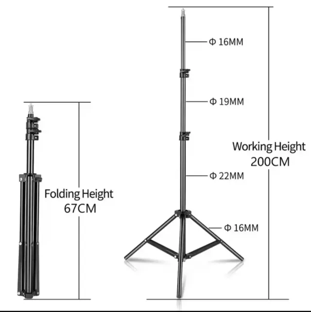 Trípode extensible para fotografía o vídeo. - Altura máxima de trabajo: 200 cm. - Altura plegado: 67 cm. - Diámetros de las secciones: 16 mm, 19 mm, 22 mm y 16 mm.