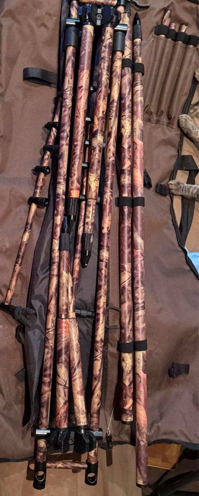 Trípode de pesca con un diseño de camuflaje. - Patas ajustables. - Soporte estable para cañas de pescar.