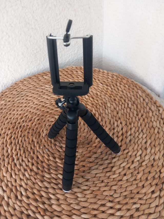Detalles del productoTrípode negro con patas flexibles y soporte para móvil o cámara.