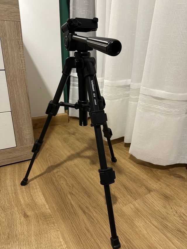 Trípode compacto y ligero, ideal para cámaras. - Color negro. - Altura ajustable. - Mango para movimiento suave.