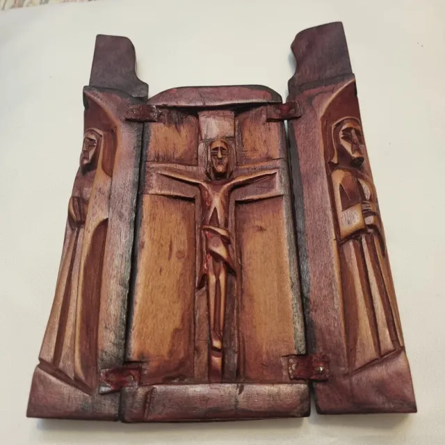 Detalles del productoPrecioso tríptico artesanal en madera maciza, completamente tallado a mano. Representa a Cristo crucificado en el centro y dos figuras laterales (Virgen y San Juan). Color rojizo natural de la madera, con pátina original.