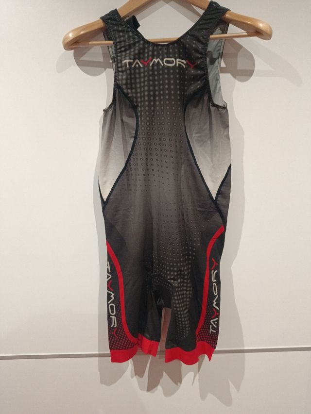 Tritraje de la marca Taymory, ideal para triatlón. Talla M - Diseño en negro, gris y rojo. - Tejido técnico.