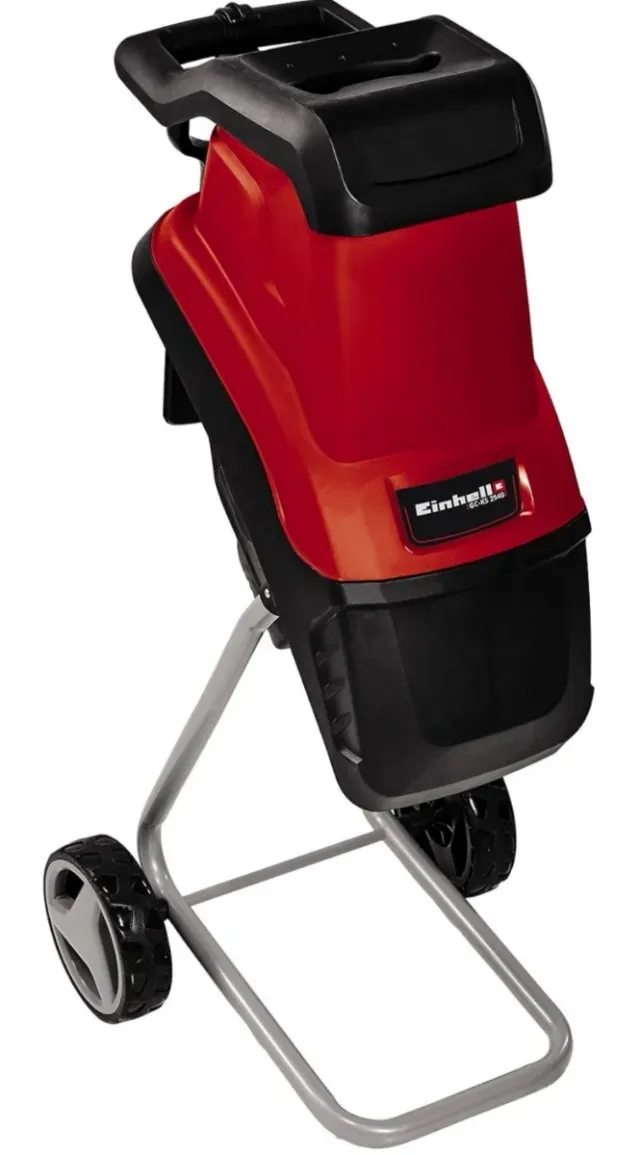 Trituradora eléctrica Einhell GC-KS 2540. - Color rojo y negro. - Con ruedas para facilitar el transporte. - Soporte metálico.