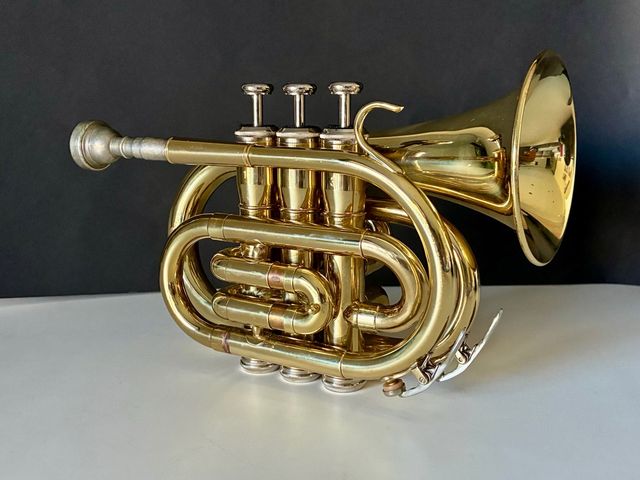 Detalles del productoTrompeta pocket sib o de bolsillo de la marca Chevallier. 3 pistones. Acabado en latón brillante. En buen estado. En su estuche original, con guantes y bayeta