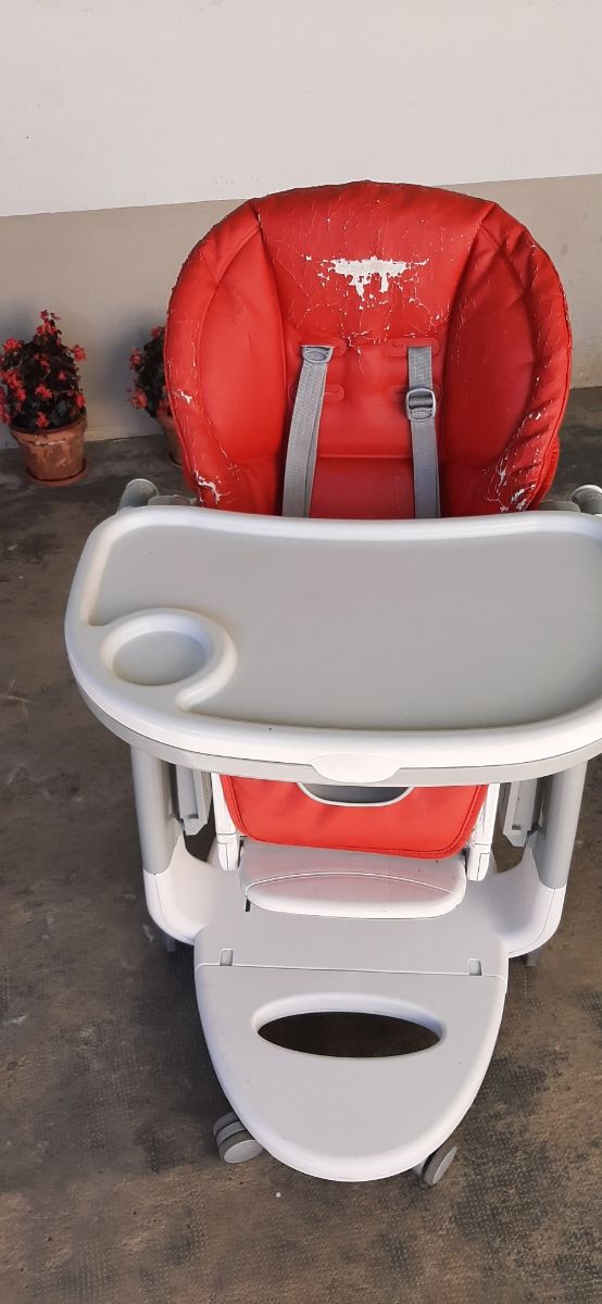 Detalles del productoTrona, con varias posiciones, se puede bajar para que el niño pueda jugar con otros niños desde la trona, está en buen uso, salvo la funda roja que se ha desgastado por el roce, rueda muy bien